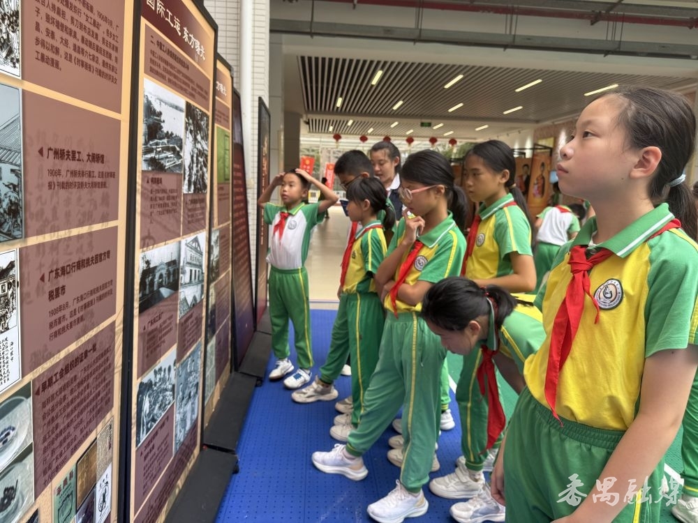 学生观看红色工运历史及番禺区劳模工匠先进事迹图片巡展